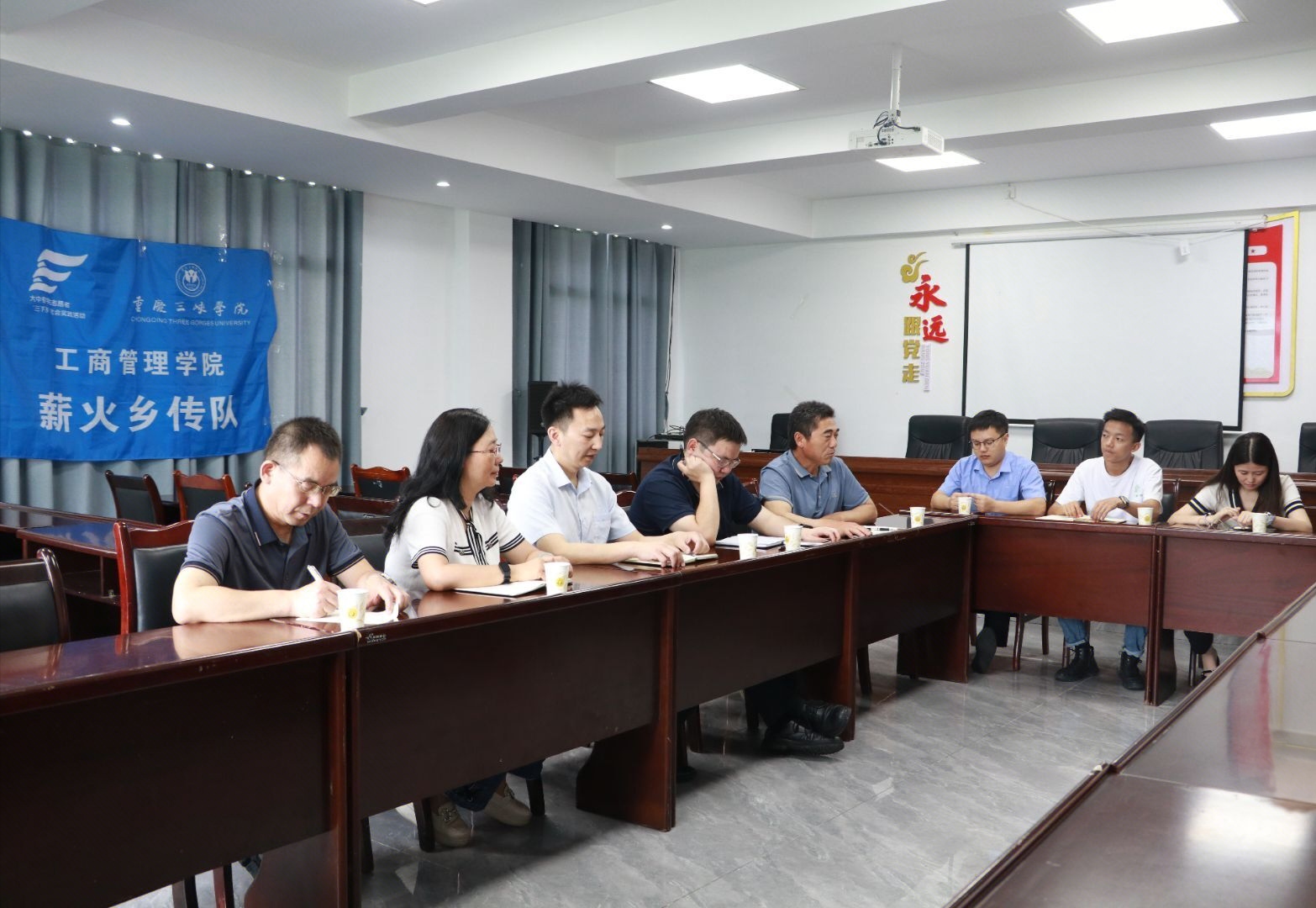 在梧桐村村委会,龙驹镇党委副书记白新亮对实践团队的到来表示热烈欢迎,他提到:“同学们扎根乡村一线,在基层服务中展现了青年担当,为梧桐村的发展注入了新活力。”副镇长刘练以自身基层工作经历,向同学们分享了三下乡实践对认知国情、锤炼本领的重要意义,鼓励大家“走出校园、走进田间,在乡土大地上汲取成长养分”。村支书程启高高度肯定了实践团队在乡村调研、便民服务等方面的工作成效,希望同学们继续发挥专业所长,为乡村发展建言献策。刘亚兰书记在座谈中强调,社会实践是青年员工受教育、长才干、做贡献的重要平台,要沉下心来了解乡村实际需求,将课堂所学与基层实践紧密结合,在服务乡村振兴中彰显新时代青年的责任与担当,鼓励同学们珍惜实践机会,在与村民的深入交流中增进对乡村的认知,锤炼吃苦耐劳的意志品质。