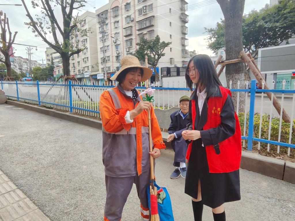 活动初始,协会负责人为志愿者详细讲解了手工花的制作步骤,耐心演示了花瓣制作、叶子组装等方法技巧。志愿者们通过学习,成功编制出一支支精美的花束。随后,志愿者们分作两支小队,将精心制作的花束送给街道劳动者,同时对他们表示问候和感谢“您辛苦了,谢谢您”,用简单而真挚的方式向辛勤工作的劳动者传递着温暖与关爱。街道工作人员谭女士笑着说道:感谢志愿者们,大家收获的不仅仅是花,更多的是一份尊重与感动。